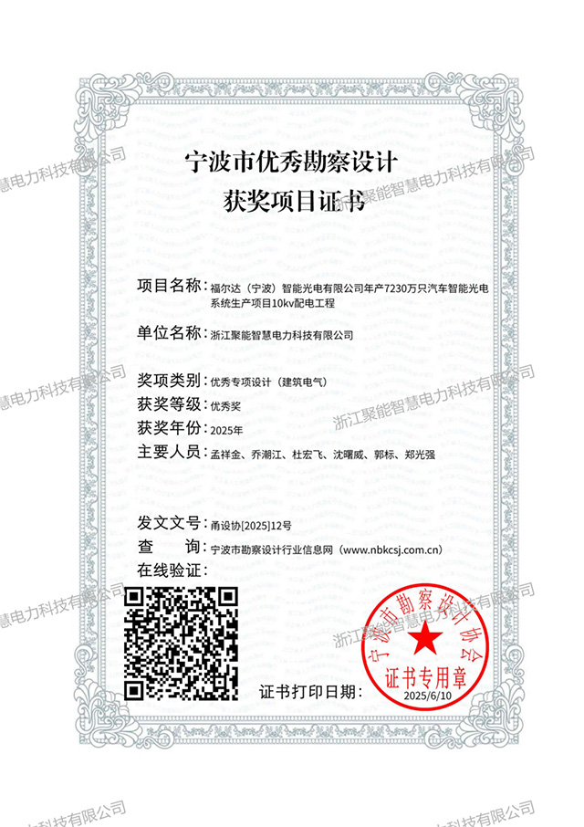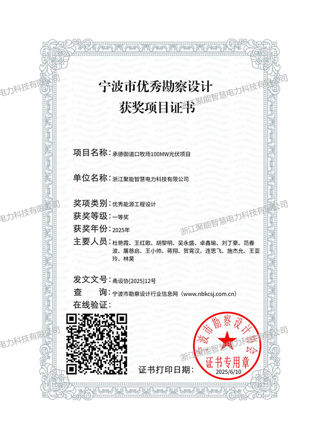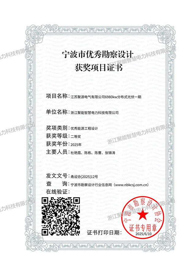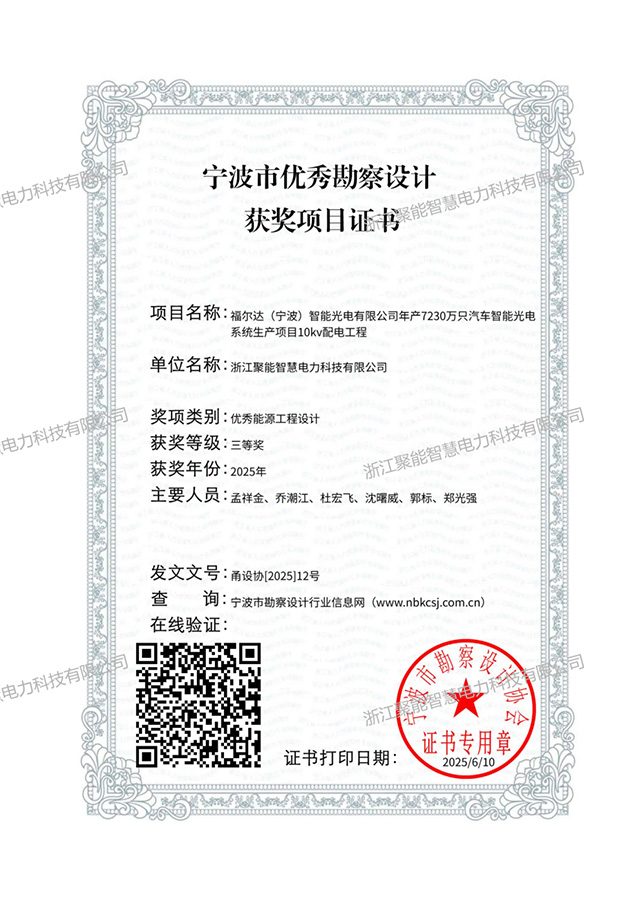 近日,2025年度宁波市优秀勘察设计奖评选结果揭晓,浙江聚能智慧电力科技有限公司凭借突出的技术创新能力与专业设计水平,在电力工程领域斩获四项大奖,彰显了公司在电力工程领域的领先地位与专业水准。